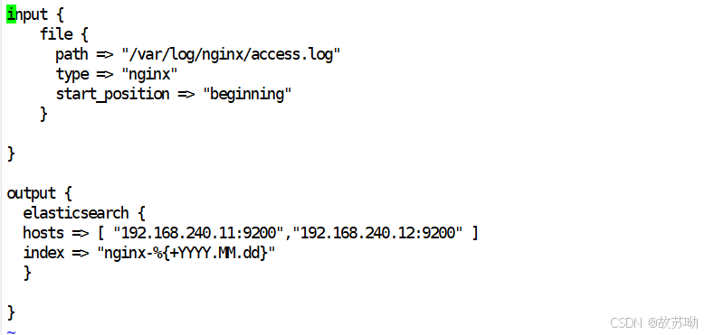 vim /etc/logstash/conf.d/nginx-log.conf input { file { path => "/var/log/nginx/access.log" type => "nginx" start_position => "beginning" } } output { elasticsearch { hosts => [ "192.168.240.11:9200","192.168.240.12:9200" ] index => "nginx-%{+YYYY.MM.dd}" } }