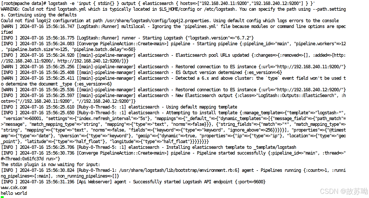 logstash -e 'input { stdin{} } output { elasticsearch { hosts=>["192.168.240.11:9200","192.168.240.12:9200"] } }' # 输入信息 www.cxk.com hello world