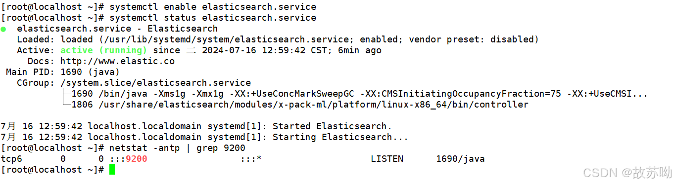 reboot systemctl start elasticsearch.service systemctl enable elasticsearch.service netstat -antp | grep 9200