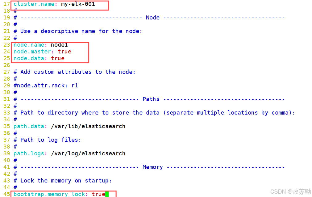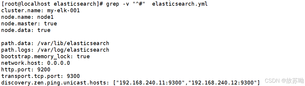 [root@node1 elasticsearch]# vim elasticsearch.yml 17 cluster.name: my-elk-001 #修改集群名字 23 node.name: node1 24 node.master: true 25 node.data: true #设置 节点名称 主从之间不能一致 24作为主节点 25作为数据节点 45 bootstrap.memory_lock: true #内存锁开启 禁止使用 swap 57 network.host: 0.0.0.0 #监听地址 61 http.port: 9200 # 默认使用端口 62 transport.tcp.port: 9300 #内部传输端口 75 discovery.zen.ping.unicast.hosts: ["192.168.240.11:9300", "192.168.240.12:9300"] #自动集群发现,加入主机名 使用单播 类似心跳线 grep -v "^#" elasticsearch.yml
