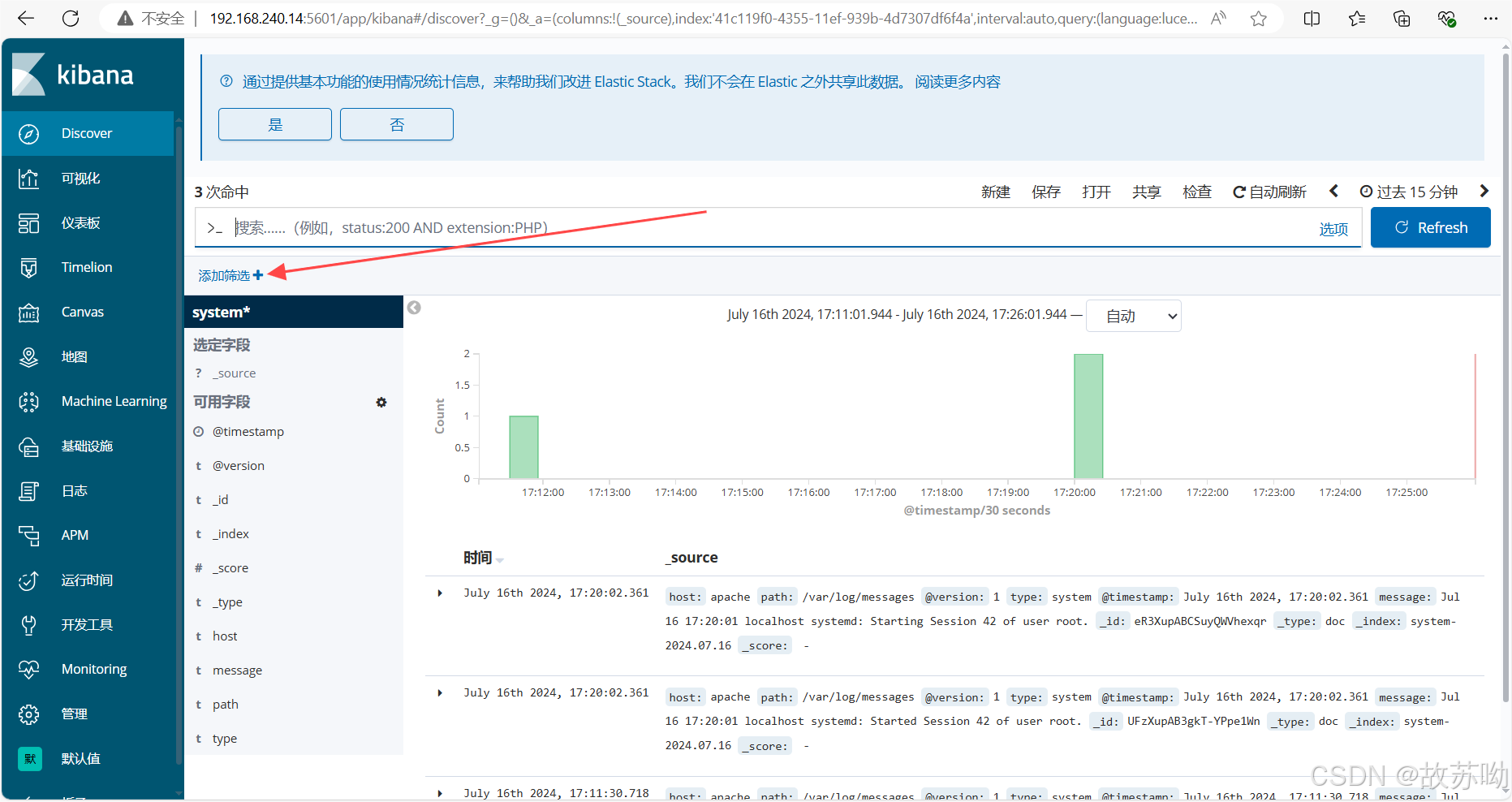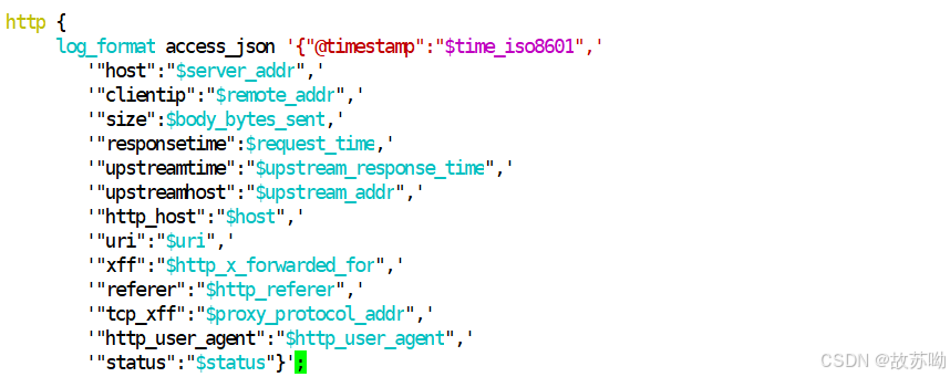 yum install -y epel-release.noarch yum install -y nginx systemctl start nginx vim /etc/nginx/nginx.conf log_format access_json '{"@timestamp":"$time_iso8601",' '"host":"$server_addr",' '"clientip":"$remote_addr",' '"size":$body_bytes_sent,' '"responsetime":$request_time,' '"upstreamtime":"$upstream_response_time",' '"upstreamhost":"$upstream_addr",' '"http_host":"$host",' '"uri":"$uri",' '"xff":"$http_x_forwarded_for",' '"referer":"$http_referer",' '"tcp_xff":"$proxy_protocol_addr",' '"http_user_agent":"$http_user_agent",' '"status":"$status"}'; nginx -s reload 另一台主机访问curl 192.168.240.13 ,生成成功日志