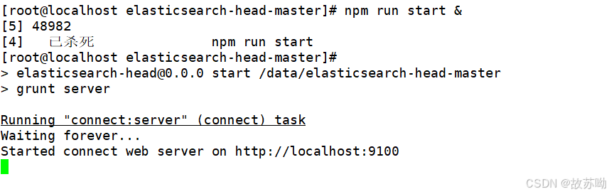 [root@localhost elasticsearch]#cd /data/elasticsearch-head/ [root@localhost elasticsearch-head]# npm run start & #elasticsearch-head 监听的端口是 9100 netstat -natp |grep 9100