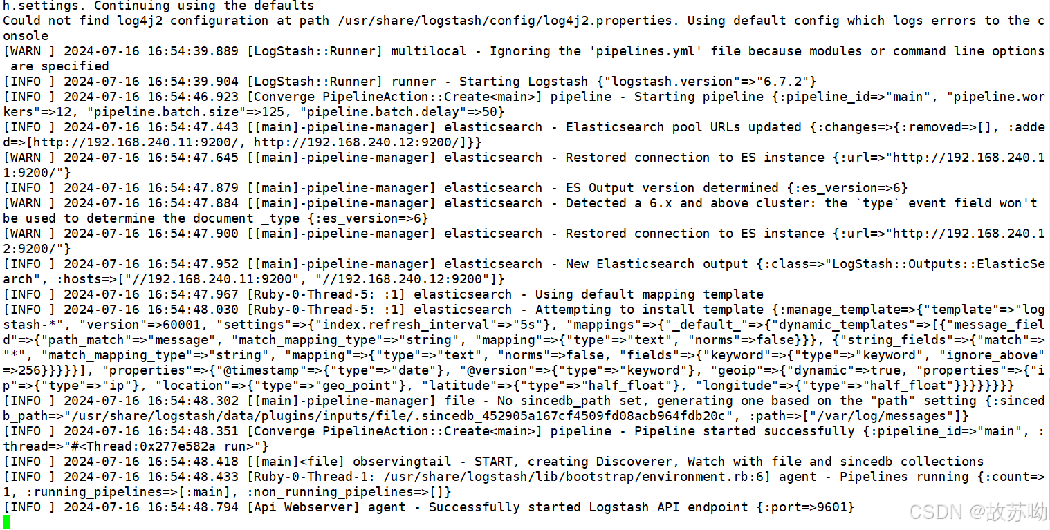 cd /opt [root@localhost data]# rpm -ivh logstash-6.7.2.rpm #开启服务 systemctl enable --now logstash.service [root@localhost opt]# ln -s /usr/share/logstash/bin/logstash /usr/bin/ # 做软连接