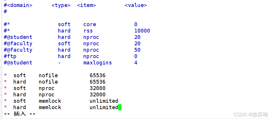 [root@localhost elasticsearch]#vim /etc/security/limits.conf ...... * soft nofile 65536 * hard nofile 65536 * soft nproc 32000 * hard nproc 32000 * soft memlock unlimited * hard memlock unlimited