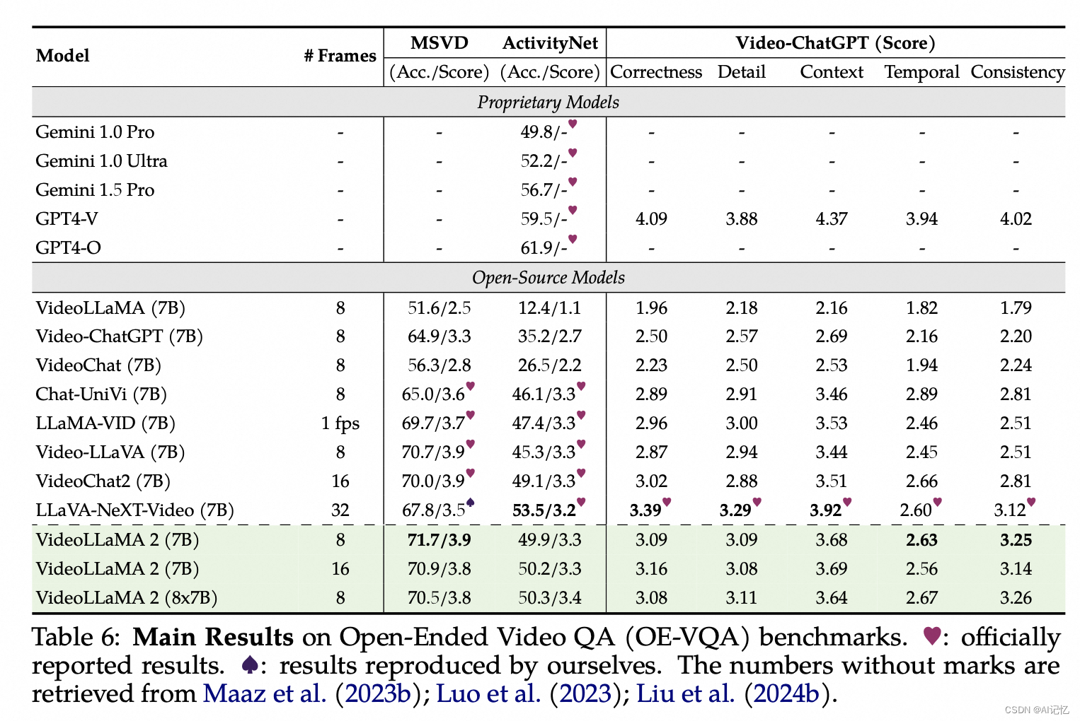 开放式视频问答 (OE-VQA):在MSVD-QA、ActivityNet-QA和Video-ChatGPT等数据集上,VideoLLaMA 2在生成答案的质量上与其他模型进行了比较,使用GPT-3.5辅助评估来确定答案的正确性。