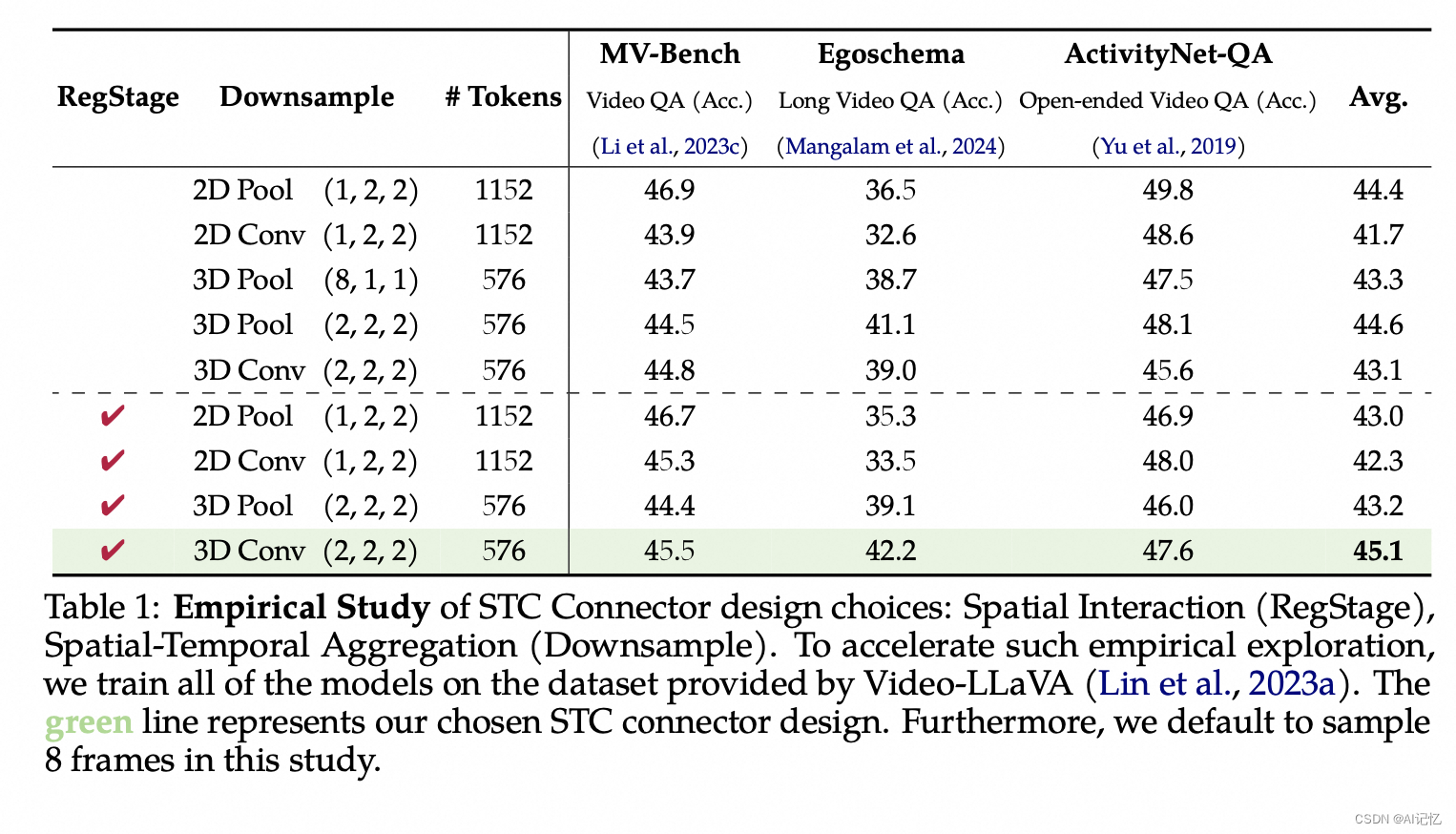 STC连接器设计选择:通过实证研究STC连接器中空间交互(RegStage)和时空聚合(Downsample)的不同设计选择,发现3D卷积与RegStage块结合(即STC连接器)在平均性能方面表现最佳。