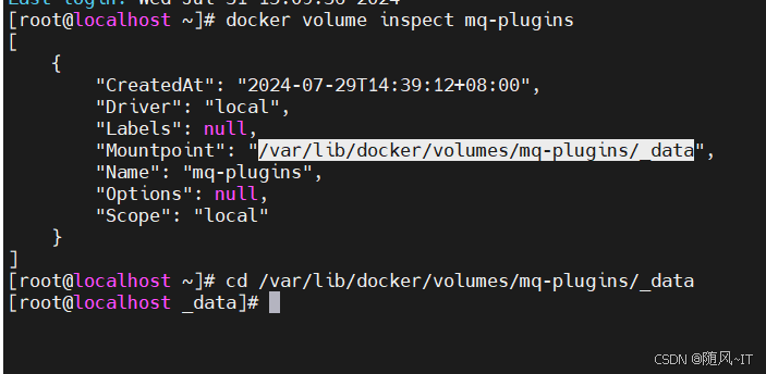 数据卷挂载的地址:"Mountpoint": "/var/lib/docker/volumes/mq-plugins/_data"