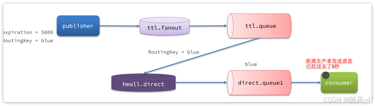 publisher发送了一条消息,但最终consumer在5秒后才收到消息。我们成功实现了延迟消息。
