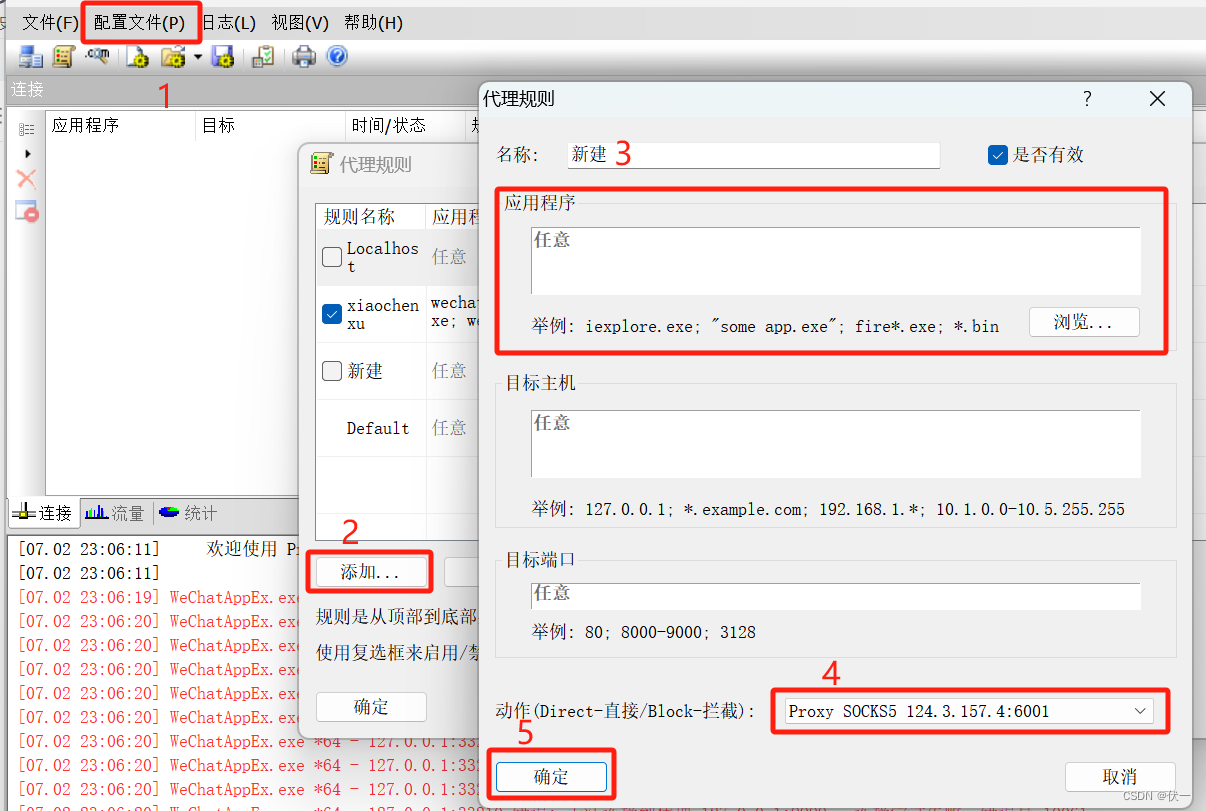 (2)配置文件》代理规则》添加》选择需要选择的程序》选择代理服务器》确定