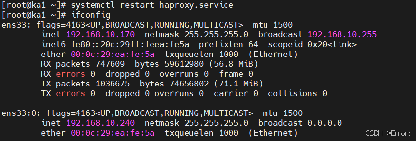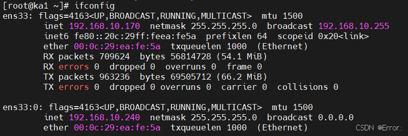 [root@ka1 ~]# ifconfig ens33: flags=4163 mtu 1500 inet 192.168.10.170 netmask 255.255.255.0 broadcast 192.168.10.255 inet6 fe80::20c:29ff:feea:fe5a prefixlen 64 scopeid 0x20 ether 00:0c:29:ea:fe:5a txqueuelen 1000 (Ethernet) RX packets 30093 bytes 2256607 (2.1 MiB) RX errors 0 dropped 0 overruns 0 frame 0 TX packets 20992 bytes 1524476 (1.4 MiB) TX errors 0 dropped 0 overruns 0 carrier 0 collisions 0 ens33:0: flags=4163 mtu 1500 inet 192.168.10.240 netmask 255.255.255.0 broadcast 0.0.0.0 ether 00:0c:29:ea:fe:5a txqueuelen 1000 (Ethernet)