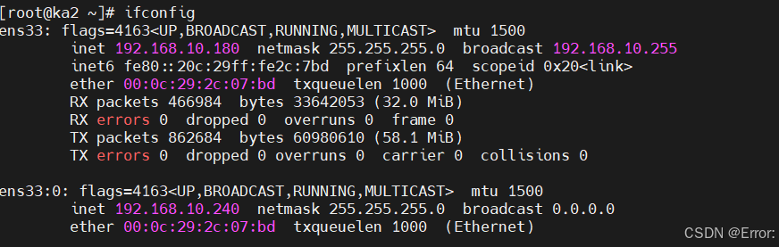 [root@ka2 ~]# ifconfig ens33: flags=4163 mtu 1500 inet 192.168.10.180 netmask 255.255.255.0 broadcast 192.168.10.255 inet6 fe80::20c:29ff:fe2c:7bd prefixlen 64 scopeid 0x20 ether 00:0c:29:2c:07:bd txqueuelen 1000 (Ethernet) RX packets 22361 bytes 1479856 (1.4 MiB) RX errors 0 dropped 0 overruns 0 frame 0 TX packets 10536 bytes 831566 (812.0 KiB) TX errors 0 dropped 0 overruns 0 carrier 0 collisions 0 ens33:1: flags=4163 mtu 1500 inet 192.168.10.245 netmask 255.255.255.0 broadcast 0.0.0.0 ether 00:0c:29:2c:07:bd txqueuelen 1000 (Ethernet)