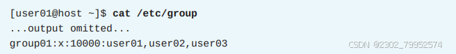 - 使用 cat /etc/group 命令 查看 /etc/group 文件存储的有关某个组的信息。