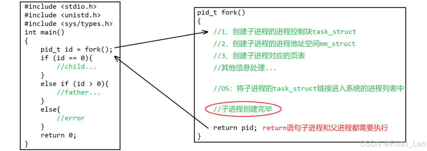 语句之前,子进程的创建过程就已经完成了。此时,子进程和父进程都已经存在,并且各自有独立的执行流。因此,fork