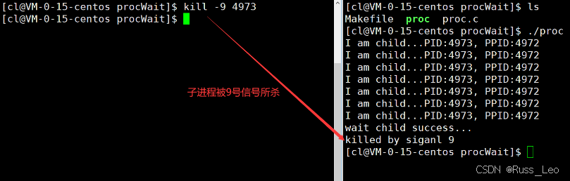 在父进程运行过程中,我们可以尝试使用kill -9命令将子进程杀死,这时父进程也能等待子进程成功。