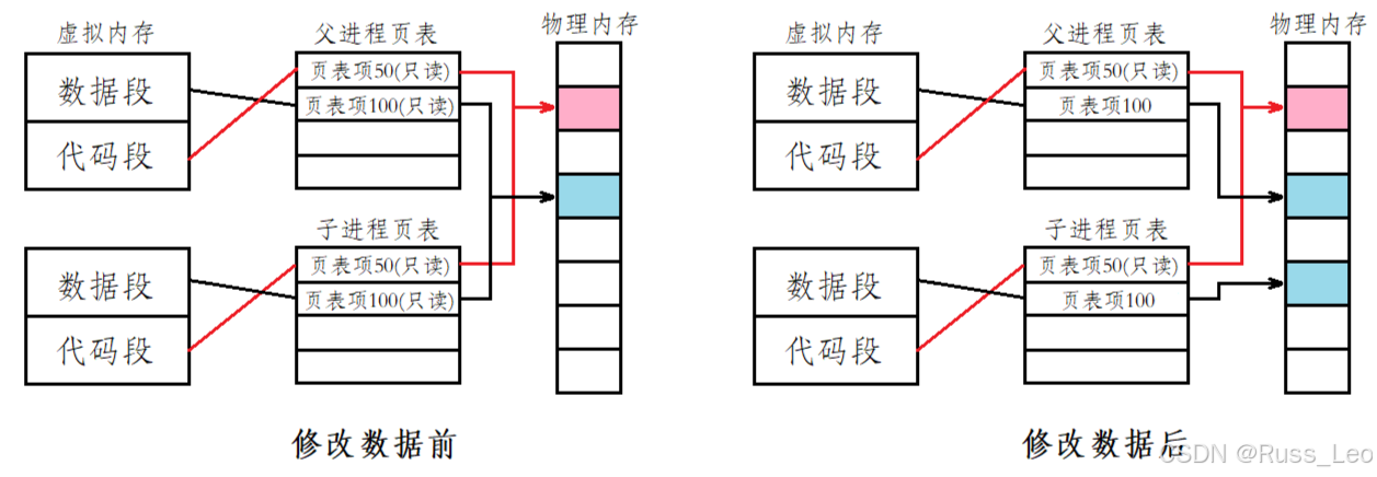 在子进程刚刚创建时,父进程和子进程的代码及数据是共享的。这意味着父进程和子进程通过页表映射到相同的物理内存区域。只有当父进程或子进程尝试修改数据时,系统才会将父进程的数据复制到一个新的内存区域,然后在新的位置上进行修改。