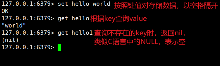 这是Redis最核心的两个命令,Redis是按照键值对存储数据的,set就是存进去key和value,get就是根据key查询value,如下图: