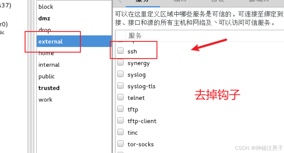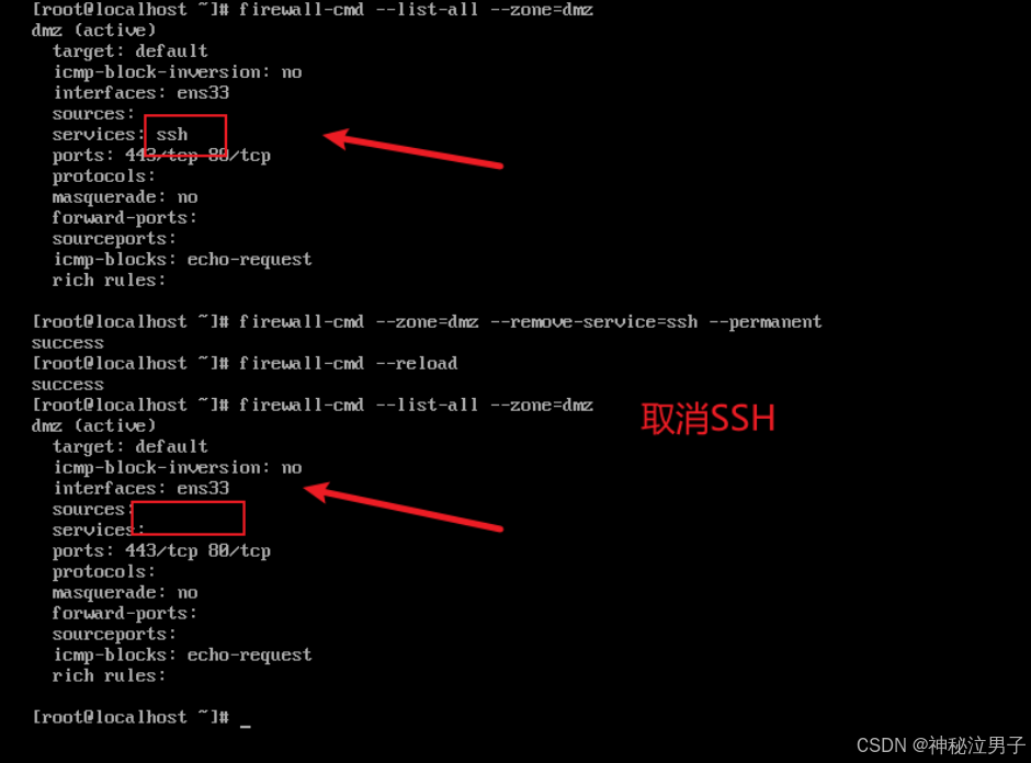 firewall-cmd --zone=dmz --remove-service=ssh --permanent firewall-cmd --reload 查看规则 firewall-cmd --list-all -zone=dmz