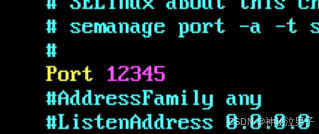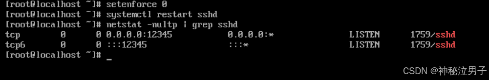 [root@localhost ~]# systemctl restart sshd [root@localhost ~]# netstat -nultp | grep sshd tcp 0 0 0.0.0.0:12345 0.0.0.0:* LISTEN 39693/sshd tcp6 0 0 :::12345 :::* LISTEN 39693/sshd