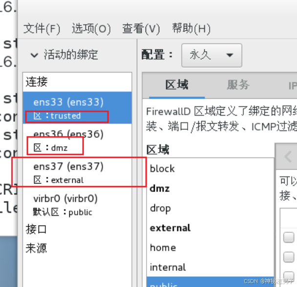 firewall-config 双击ens33 点击永久 trusted ens36 dmz ens37 external