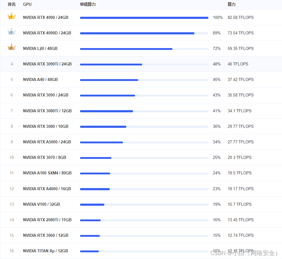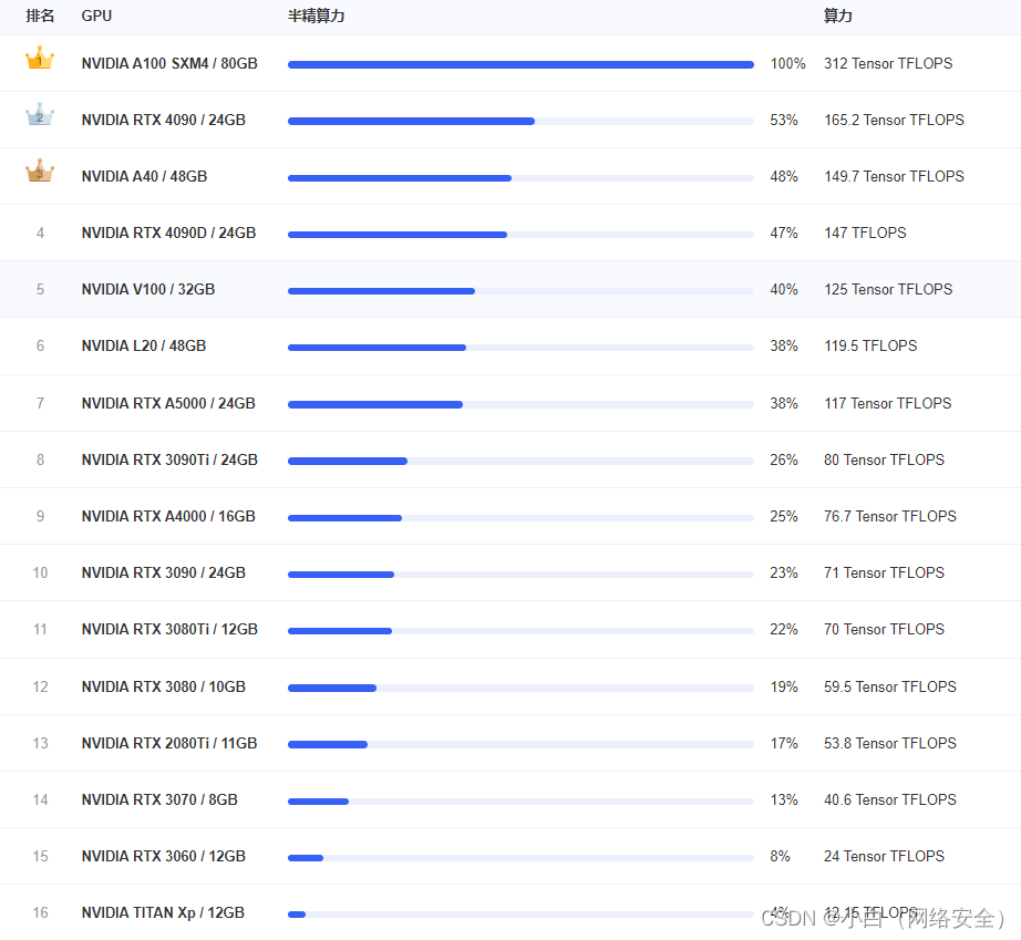AutoDL:提供服务稳定、价格公道的 GPU 租用服务,坚持为用户提供极具性价比的会员价格。该平台的 GPU 算力排名以其提供的加速卡型号进行算力排名,其中 NVIDIA GPU 以 Peak FP16 Tensor TFLOPS with FP32 Accumulate 值为半精算力值,