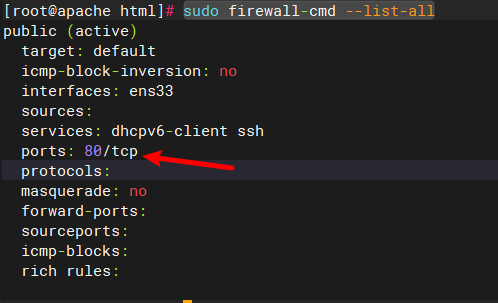 sudo firewall-cmd --zone=public --add-port=80/tcp --permanent sudo firewall-cmd --reload sudo firewall-cmd --list-all