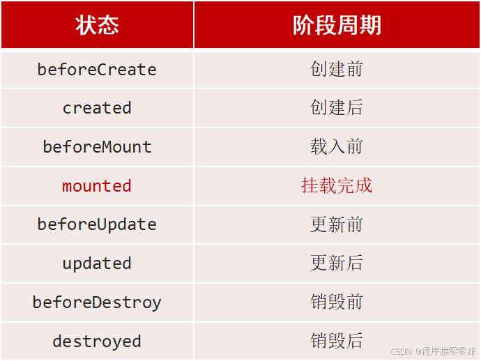 mounted:挂载完成,Vue初始化成功,HTML页面渲染成功。(发送请求到服务端,加载数据)