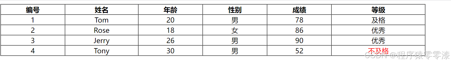 : HTML 主体部分,包含页面的可见内容。 : Vue.js 应用的根元素,用来绑定 Vue 实例。 : 表格元素,用于显示用户数据。 : 表格行,包含表头和用户数据。 : 表头单元格,显示表格列的标题。 - 列标题: 编号、姓名、年龄、性别、成绩、等级。