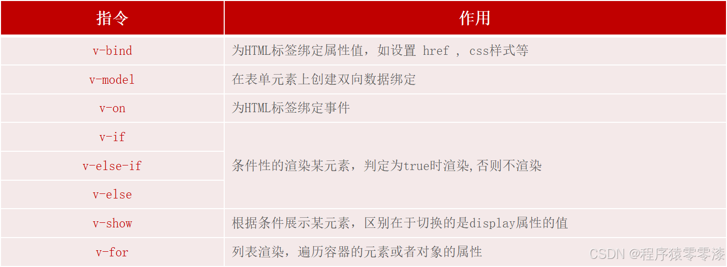 指令:HTML 标签上带有 v- 前缀 的特殊属性,不同指令具有不同含义。例如:v-if,v-for…