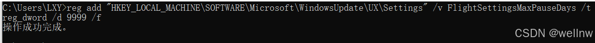 reg add "HKEY_LOCAL_MACHINE\SOFTWARE\Microsoft\WindowsUpdate\UX\Settings" /v FlightSettingsMaxPauseDays /t reg_dword /d 9999 /f