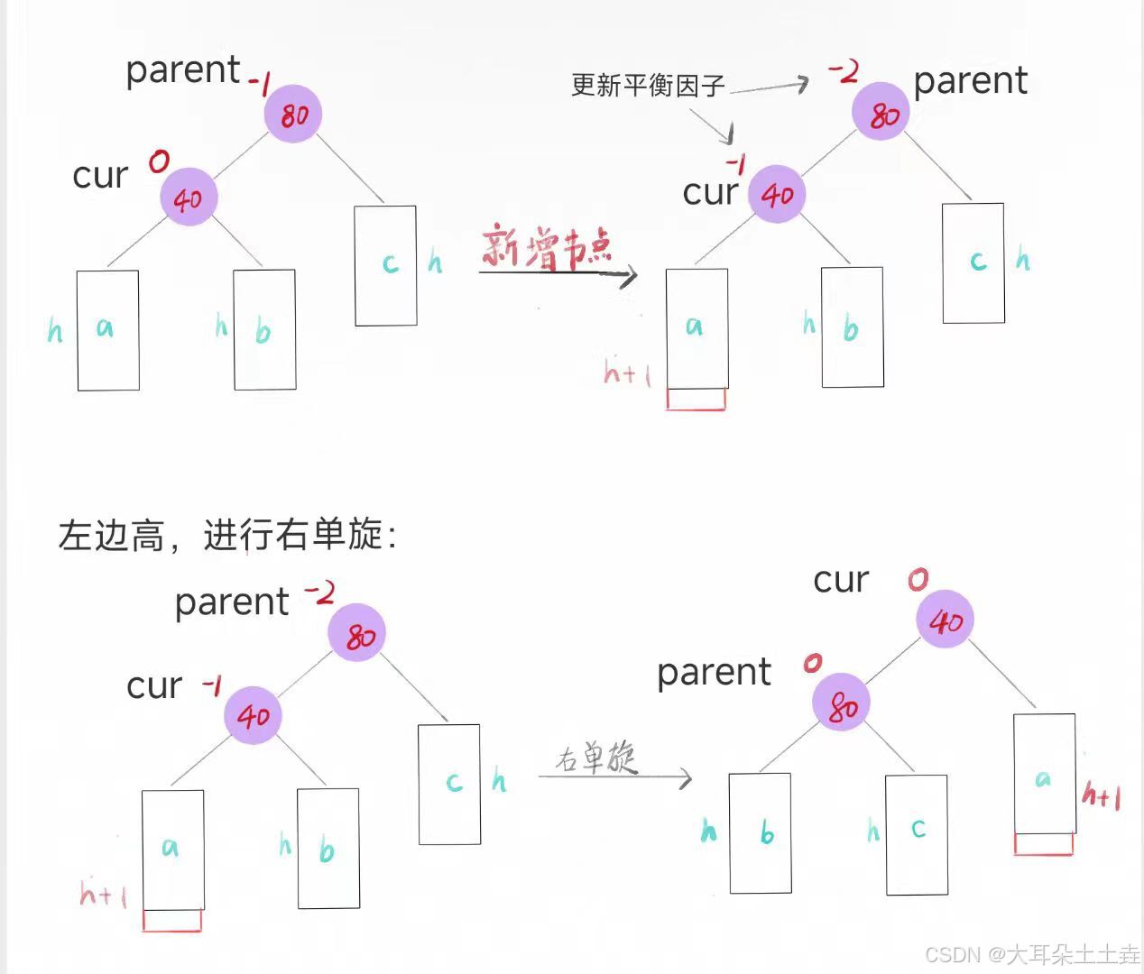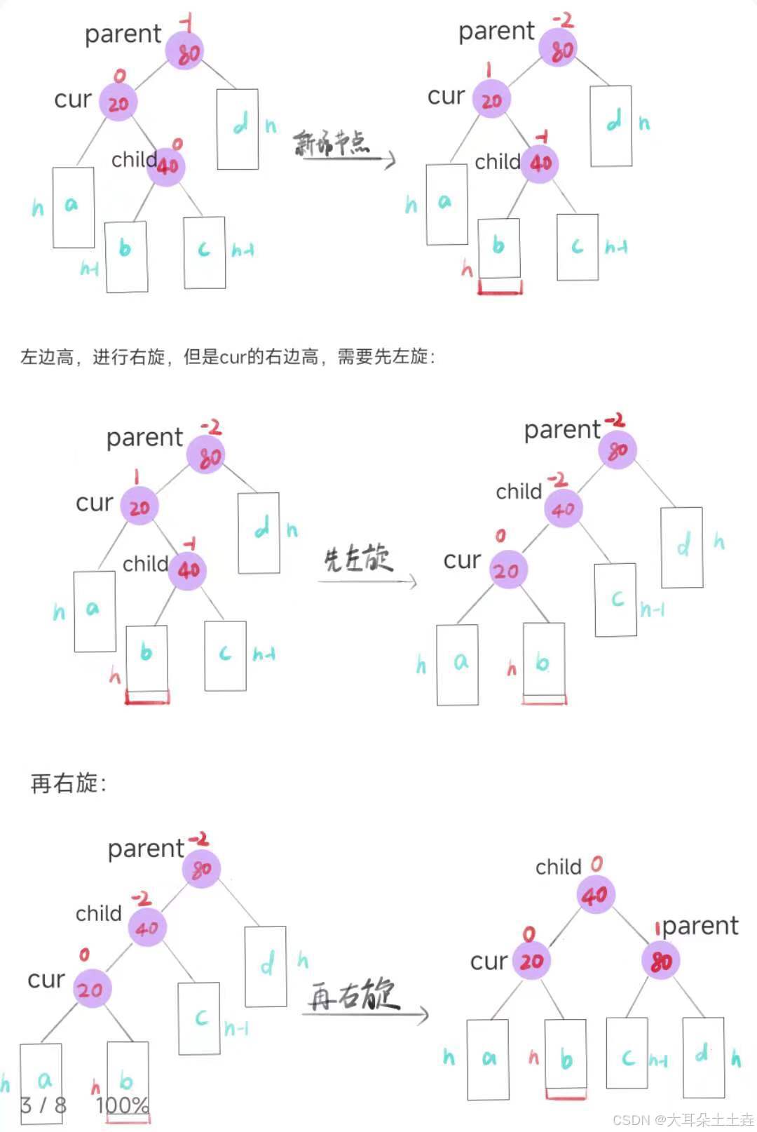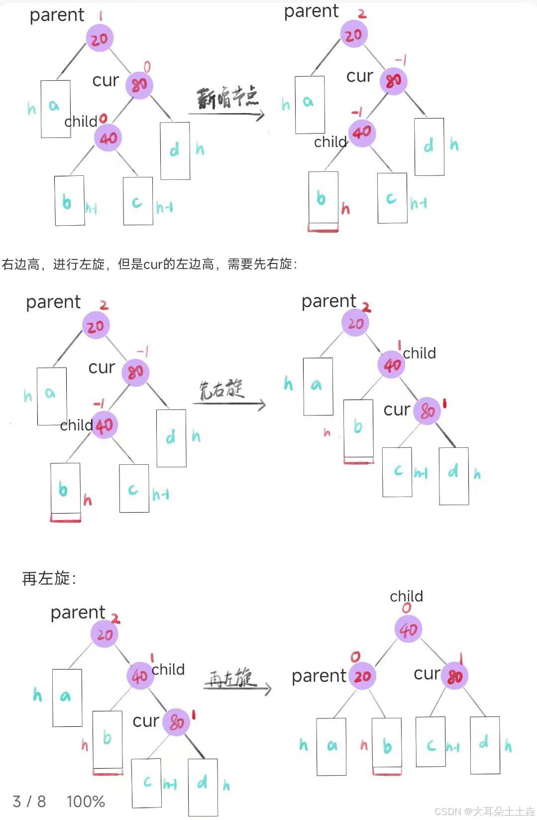 如下图所示,较高右子树(以cur节点为根节点的树)的左侧(以child节点为根节点的树),插入节点,注意这里可以插入child的左侧或右侧,只要插入在child的子树上即可,所以可以是下图中的b或c,这里选择b: