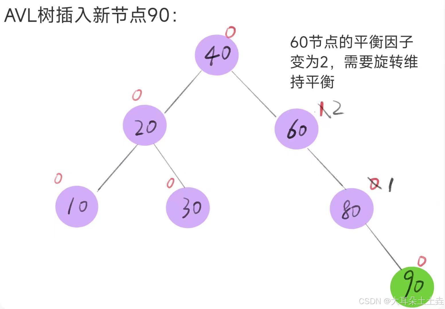 AVL树插入新节点90之后,pParent也就是80节点的平衡因子就需要更新为1,继续往上更新,直到60节点的平衡因子被更新为2,说明不符合AVL树的性质,就需要进行旋转来维持平衡。
