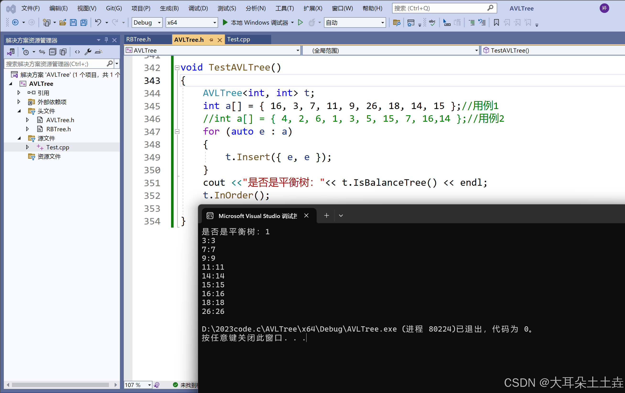 void TestAVLTree() { AVLTree t; int a[] = { 16, 3, 7, 11, 9, 26, 18, 14, 15 };//用例1 //int a[] = { 4, 2, 6, 1, 3, 5, 15, 7, 16,14 };//用例2 for (auto e : a) { t.Insert({ e, e }); } cout <<"是否是平衡树:"<< t.IsBalanceTree() << endl; t.InOrder(); }