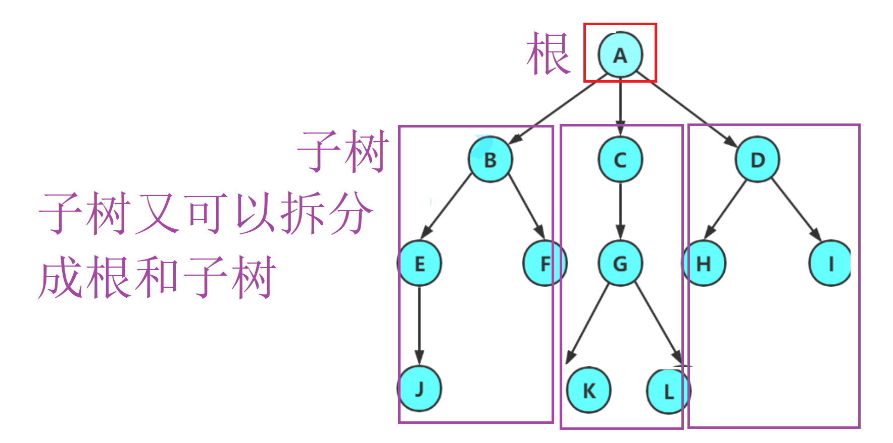 树是递归定义的。树可以由根和子树组成。子树又可以跟和子树组成。