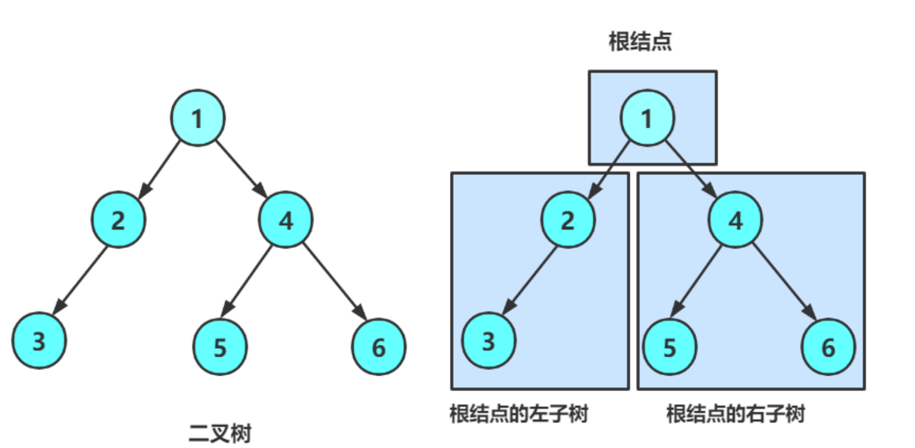 - 由一个根结点加上两棵别称为左子树和右子树的二叉树组成