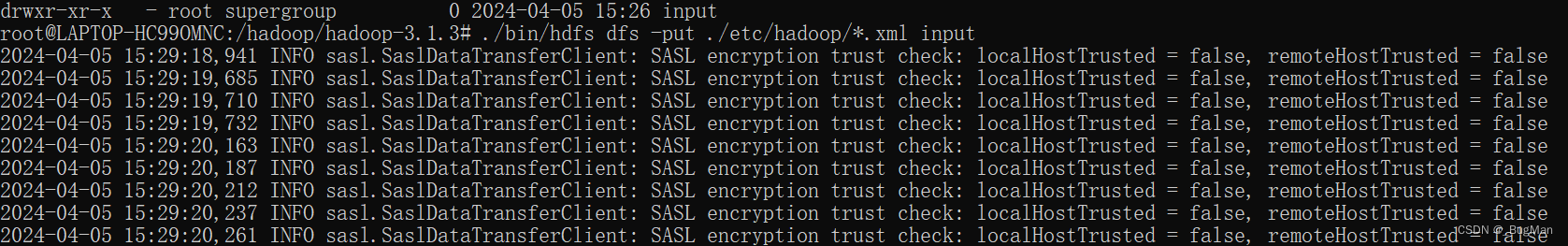 ./bin/hdfs dfs -put ./etc/hadoop/*.xml input