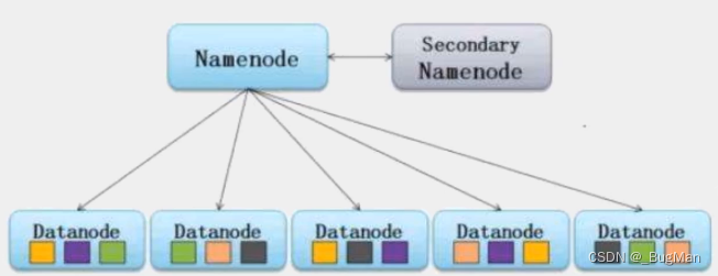 这三个东西是属于HDFS的,dataNode是具体存放数据的节点,nameNode用来记录所有dataNode的信息,secondNameNode是nameNode的备份: