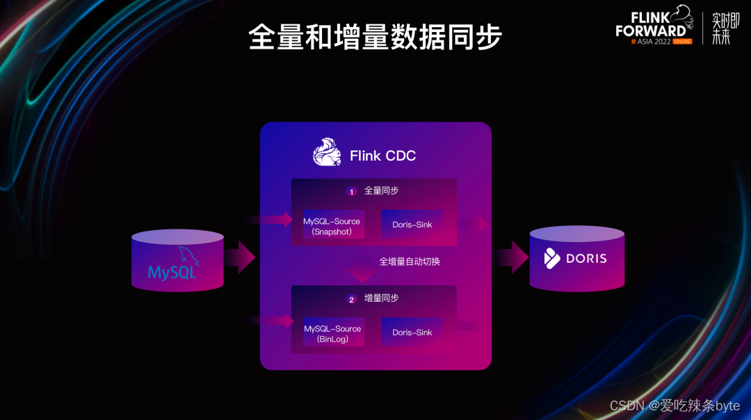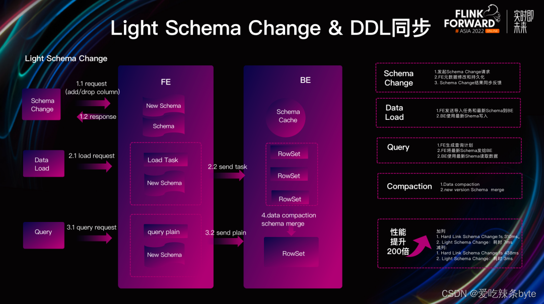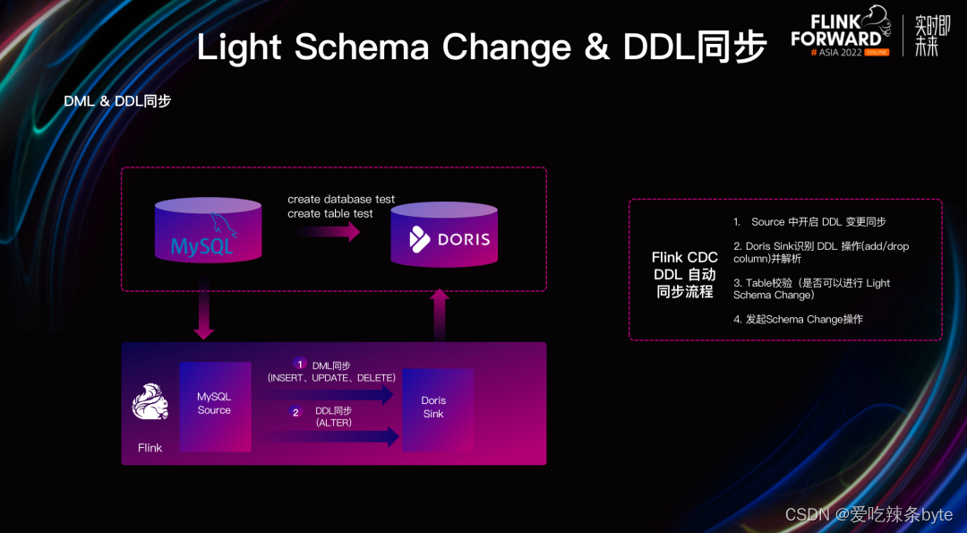 注:轻量表结构变更Light Schema Change: 在Doris1.2版本中,对数据表的加减列操作,不需要同步更改数据文件,仅需要在FE中更新元数据即可,从而实现毫秒级的Schema Change操作。与此同时,使得Doris在面对上游数据表维度变化时,可以更加快速稳定实现表结构同步,保证系统的高效且平稳运转。通过 Flink CDC,可实现上游数据库到 Doris 的 DML 和 DDL 同步,进一步提升了实时数仓数据处理和分析链路的时效性与便捷性。