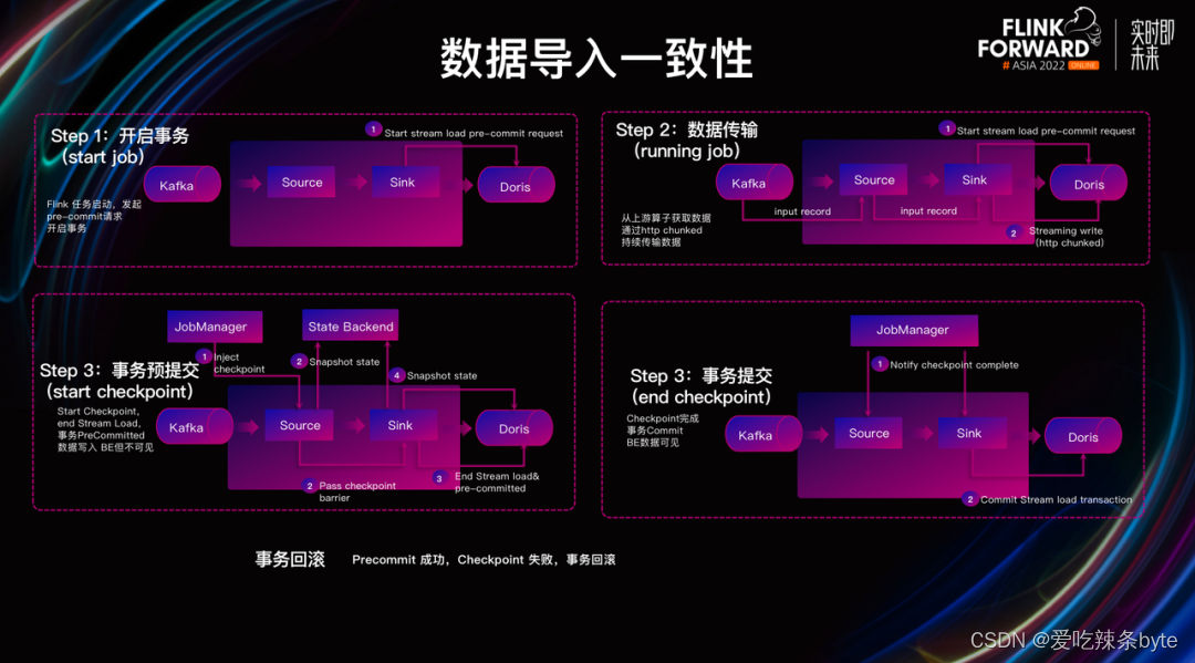 综上可知,利用 Flink CDC结合Doris 两阶段事务提交保证了数据写入一致性。需要注意的是,在该过程中可能遇到一个问题:如果事务预提交成功、但 Flink Checkpoint 失败了该怎么办?针对该问题,Doris 内部支持对写⼊数据进⾏回滚(Rollback),从而保证数据最终的⼀致性。