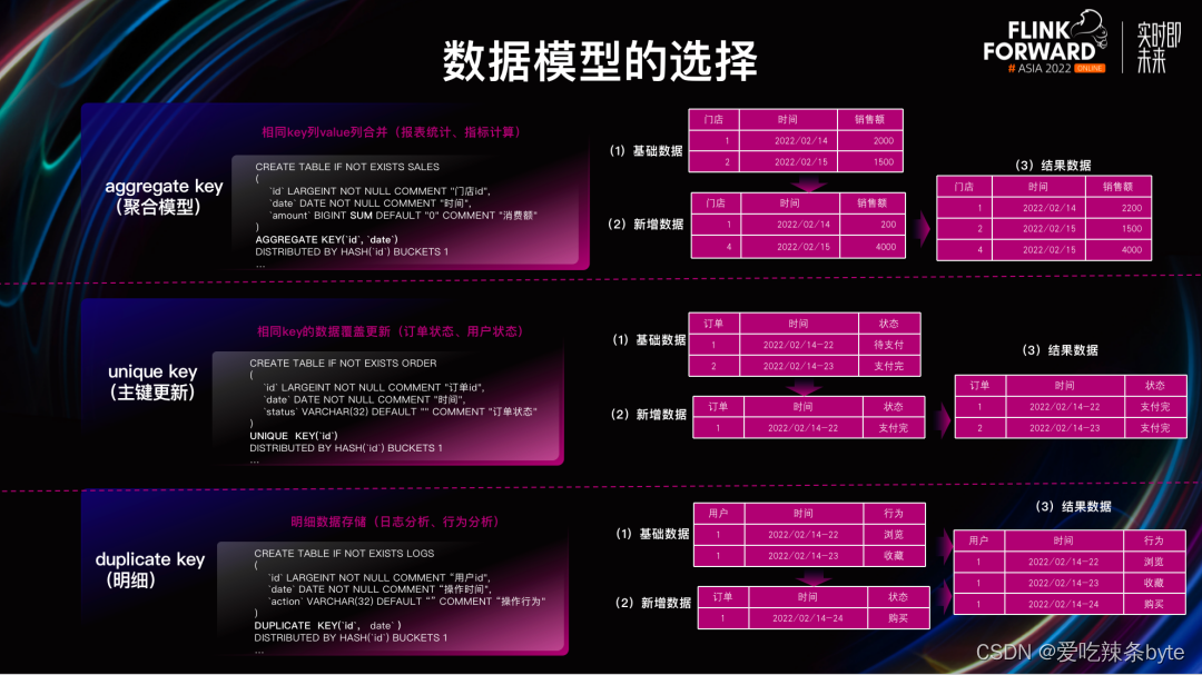 Doris针对不同场景,提供了不同的数据模型,分别为明细模型、聚合模型、主键模型。