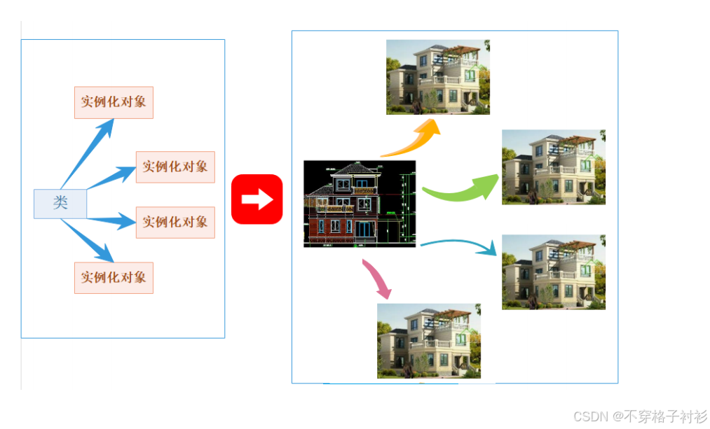 (3)⼀个类可以实例化出多个对象,实例化出的对象 占⽤实际的物理空间,存储类成员变量。打个⽐⽅:类实例化出对象就像现实中使⽤建筑设计图建造出房⼦,类就像是设计图,设计图规划了有多少个房间,房间⼤⼩功能等,但是并没有实体的建筑存在,也不能住⼈,⽤设计图修建出房⼦,房⼦才能住⼈。同样类就像设计图⼀样,不能存储数据,实例化出的对象分配物理内存存储数据。