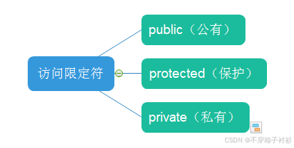 (2)public修饰的成员在类外可以直接被访问;protected和private修饰的成员在类外不能直接被访问,protected和private是⼀样的,以后继承章节才能体现出他们的区别。