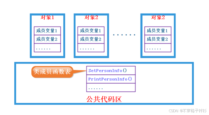 分析⼀下类对象中哪些成员呢?类实例化出的每个对象,都有独⽴的数据空间,所以对象中肯定包含成员变量,那么成员函数是否包含呢?⾸先函数被编译后是⼀段指令,对象中没办法存储,这些指令存储在⼀个单独的区域(代码段),那么对象中⾮要存储的话,只能是成员函数的指针。