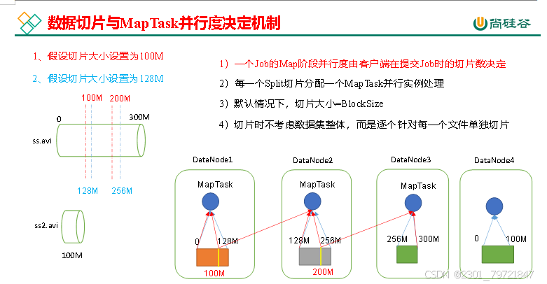 2)数据切片(MapReduce程序计算输入数据的单位):只是在逻辑上对输入进行分片,不在磁盘上将其切成分片进行存储。