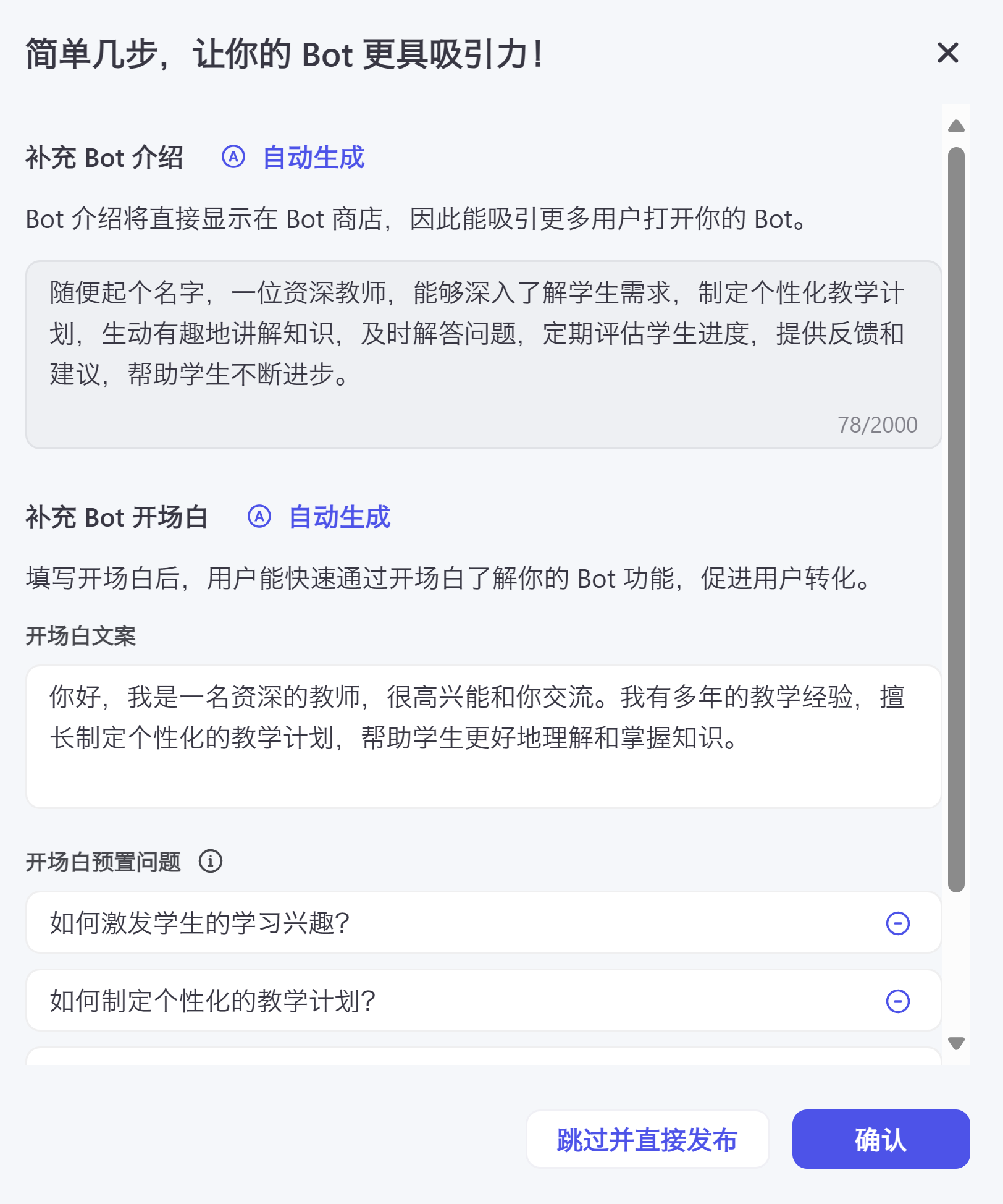 它会让你创建一些开场白之类的,直接“确认”即可。