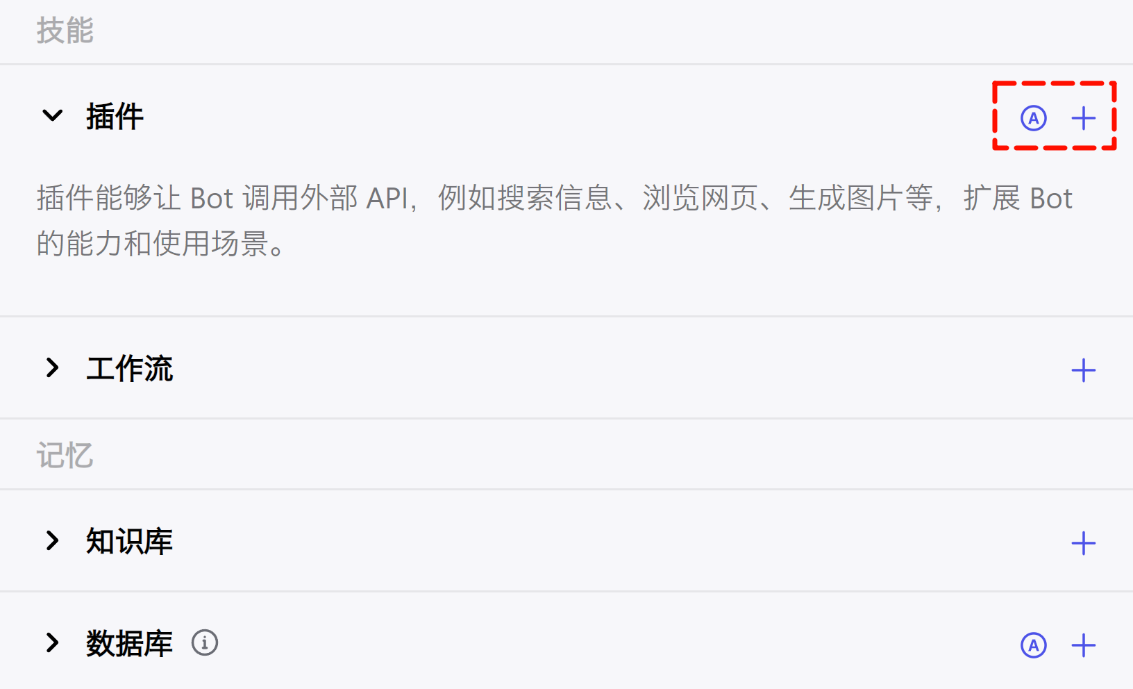 这部分的内容有点多,入门级的我们,只需要关注“插件”和“知识库”。