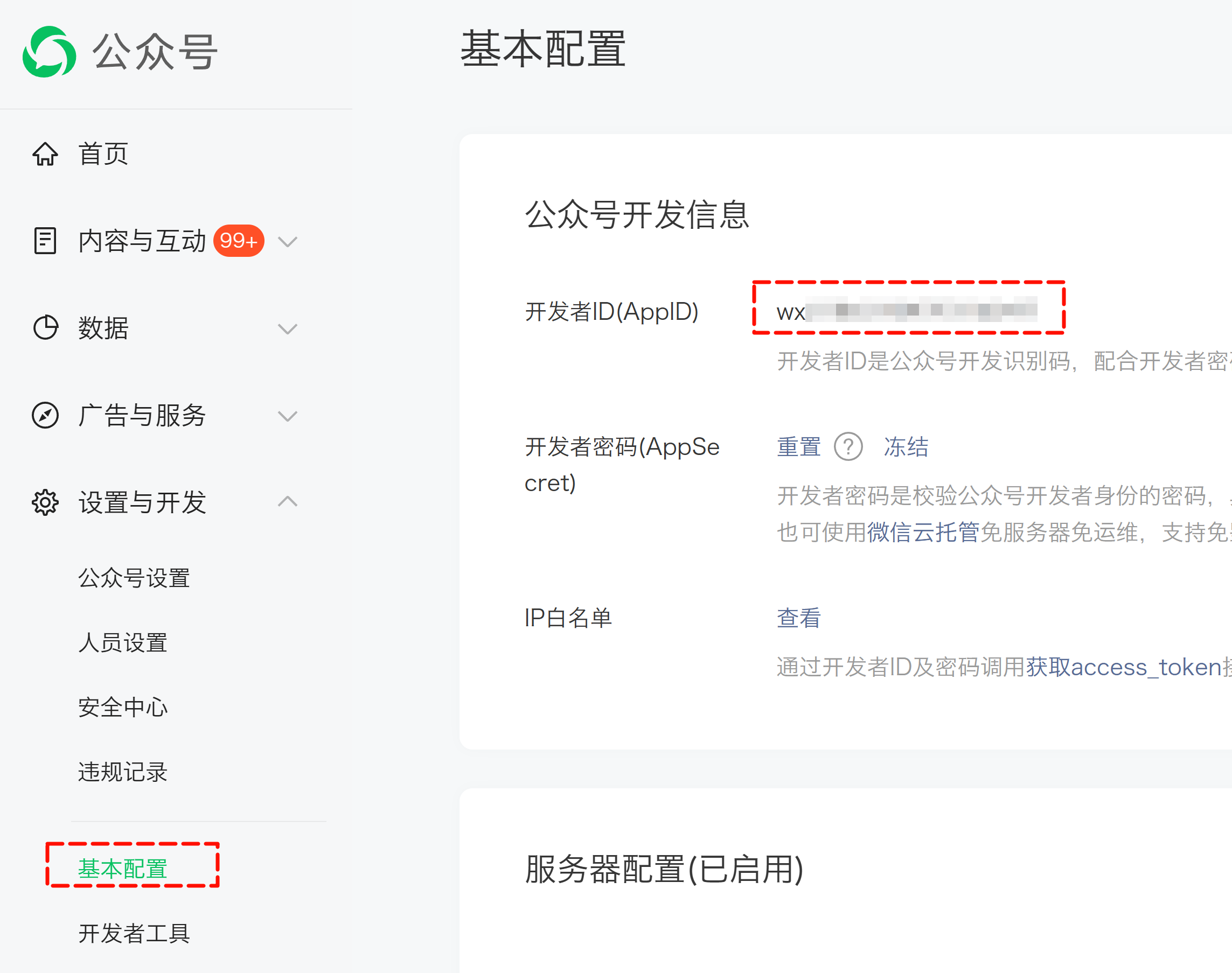 注册好了后,在公众号后台点击“设置与开发”,把右边的“开发者ID(AppID)”复制下来。