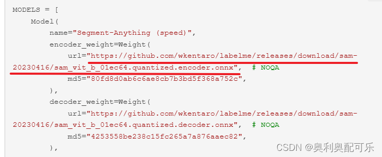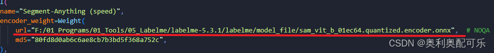 打开文件:labelme-5.3.1\labelme\ai\__init__.py 将刚刚那6个链接的位置替换为本地文件的位置,比如我是将下载好的6个文件放到了F:\01_Programs\01_Tools\05_Labelme\labelme-5.3.1\labelme\model_file中,就把那个链接改成了如下图这样
