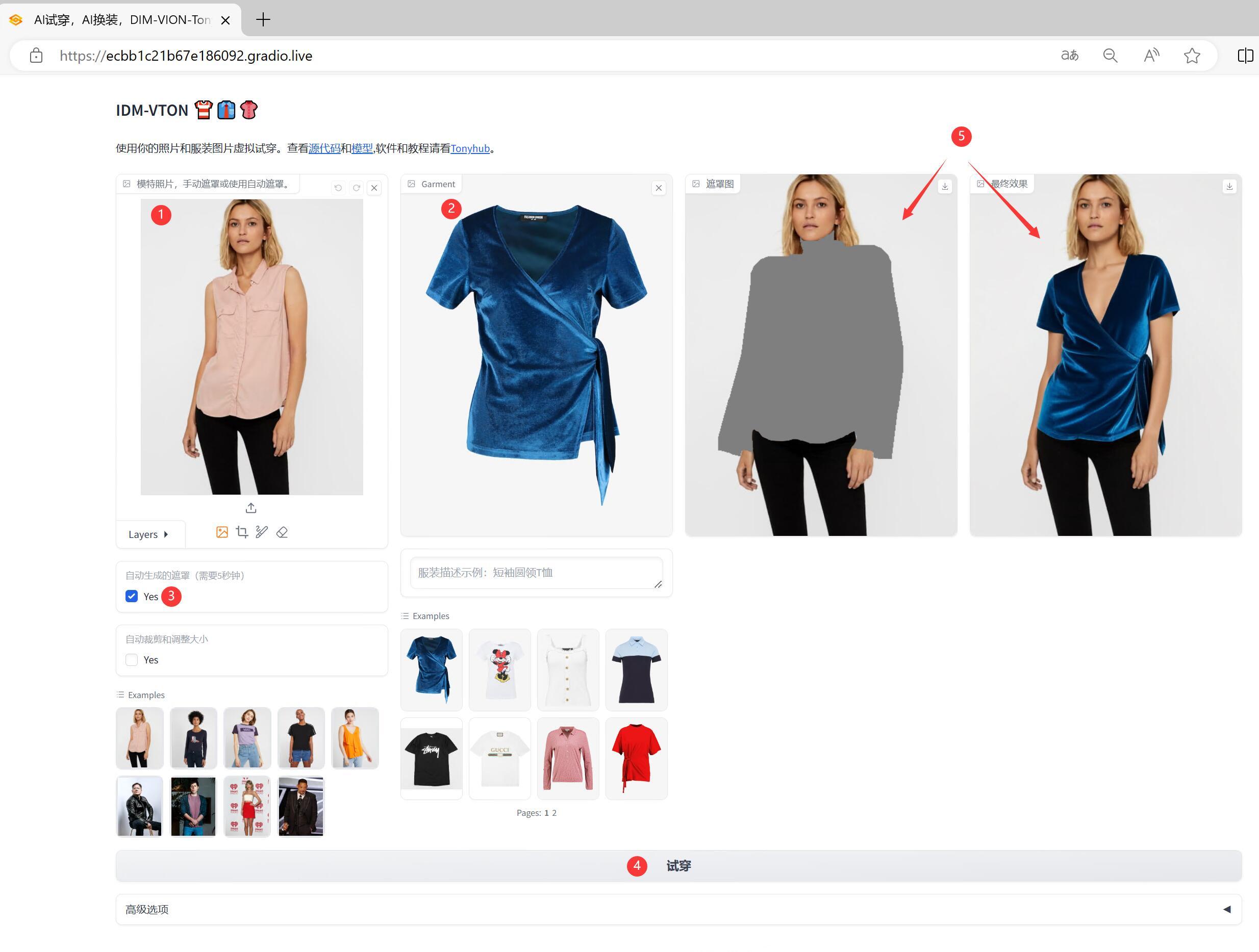 用法还是和之前讲的一模一样,上传模特照片和衣服照片,点击试穿。等待一会儿,就可以在右上方看到最终的效果图了。