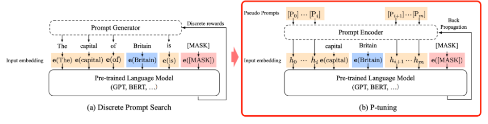 P-tuning v1 微调方法是将 Prompt 加入到微调过程中,只对 Prompt 部分的参数进行训练,而语言模型的参数固定不变。如下图所示: