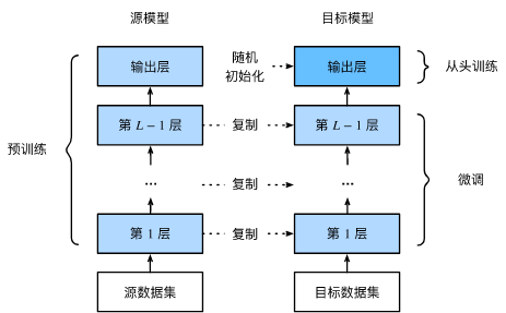 下图表示的是将预训练模型的前 L-1 层的参数复制到微调模型,而微调模型的输出层参数随机初始化。在训练过程中,通过设置很小的学习率,从而达到微调的目的。
